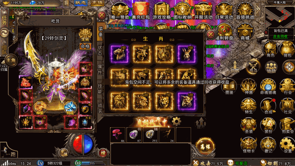 礼包:100w元宝箱*4000,4级命运宝石*70,4级轮回宝石*70,龙币*6000,神武甲灵石*3000,天书密卷*70,天书金卷*50,雷霆天降*70,玉玺碎片*2500,化神灵晶*400,神器图纸自选箱*500,神器图纸随机箱*500,特戒自选箱*50,生肖高级随机宝箱*40